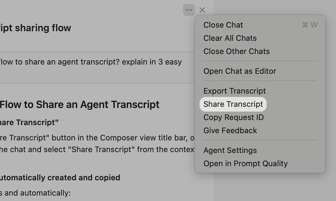 Generate a read-only transcript of any agent conversation to include in your PRs or internal documentation. Transcripts can be forked so others can start new agent conversations from the same context.