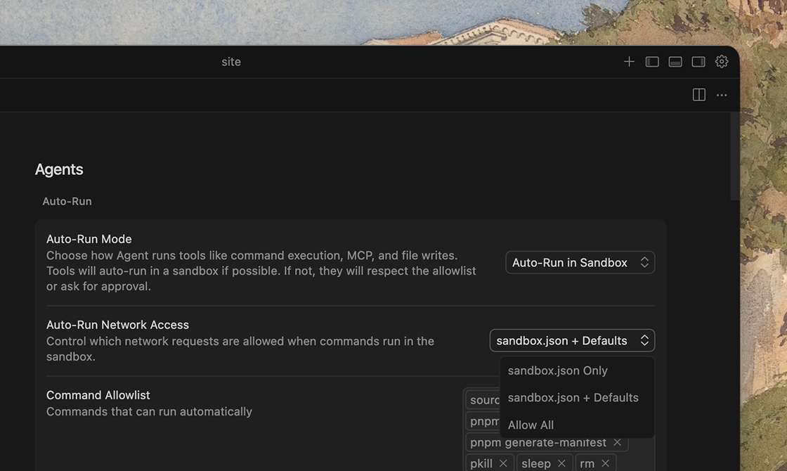 Common operations like git clone, npm install, and pip install now work out of the box in the agent sandbox. You can extend or override these defaults per-project.